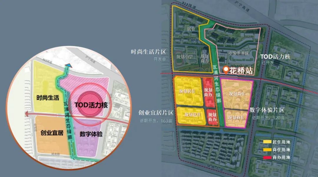 作为“双11号线”唯一换乘站,花桥站周边正崛起一座“轨交上的城市”。中骏世界城作为昆山最大TOD商业综合体,已实现商业、出行与生活的“三圈融合”。未来,以瓦浦河生态绿廊为轴,这里将形成时尚生活、数字体验、创业宜居三大片区,近期更将推出280亩土地进行整体开发。