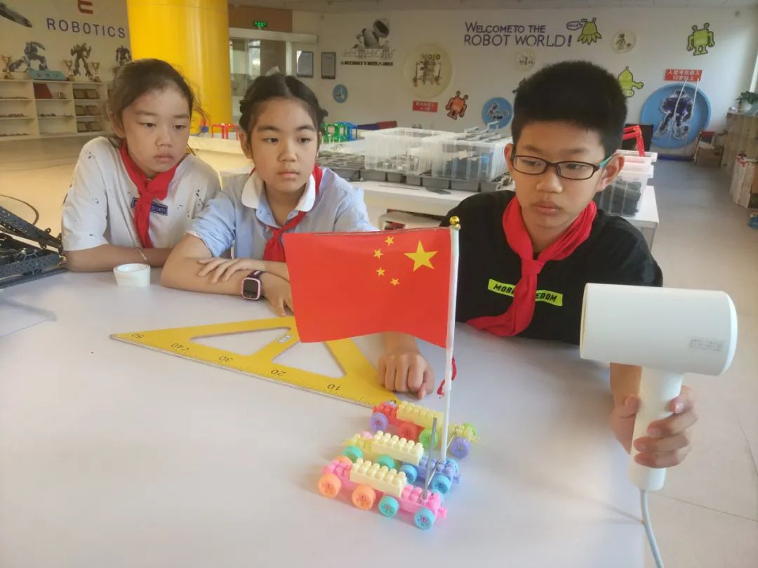这个创意设计是娄江少科院“红旗小队”的潘晨蕊、何连响、胡若菲配合市文明办完成的,主要是通过“提竿+转动”解决国旗“强风易损”问题。
