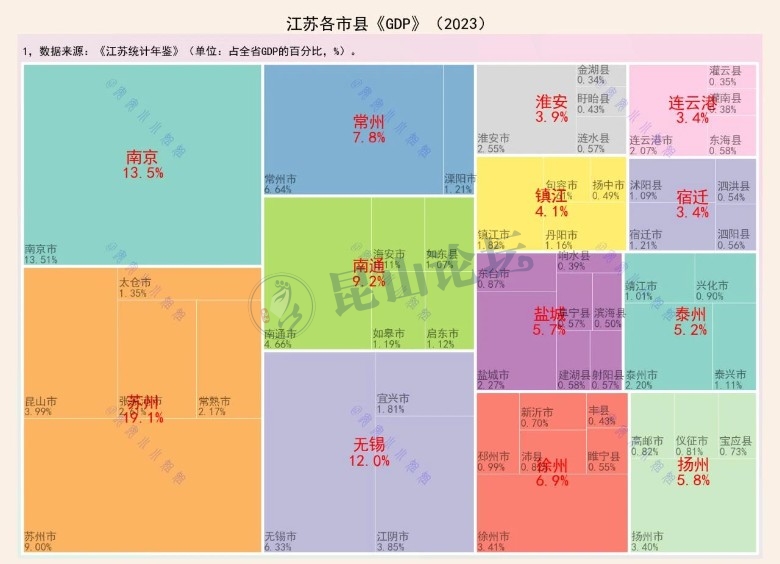 细心的网友会发现,盐城这一个大方块里,还有一个小的名为盐城的方块,这是因为在现行的行政区划体系中,地级盐城由三部分构成:盐城的市辖区、直接管辖的县和代管的县级市。为了更好区分他们的区别,以及考虑到散装的特性,在图表中,将市辖区作为一个整体进行统计。图表中,将江苏的财富划分为100份,即大家熟知的百分比,各区域名称下的数字,表示占江苏财富(GDP)的百分比。