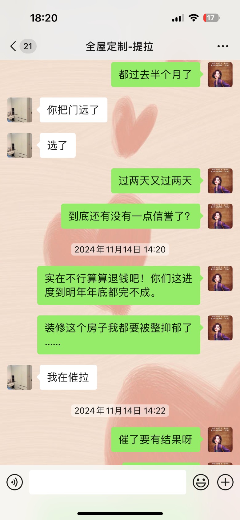 我合同上写的是全屋定制柜,他叫木工给我打的柜子,我订的是系统窗,他给我装的是普通的那种窗户。到现在马上快一年了,他告诉我他收不了尾,未完工明细如下:阳光房、沙发、茶几、床、床垫、楼梯扶手、全屋开关插座、厨房拉篮、窗帘、纱窗等,一些小的细节我就不一 一列举了。尾款还差他7000块,这些远远不止7000块。具体的大家看聊天记录吧,更有说服力!!!