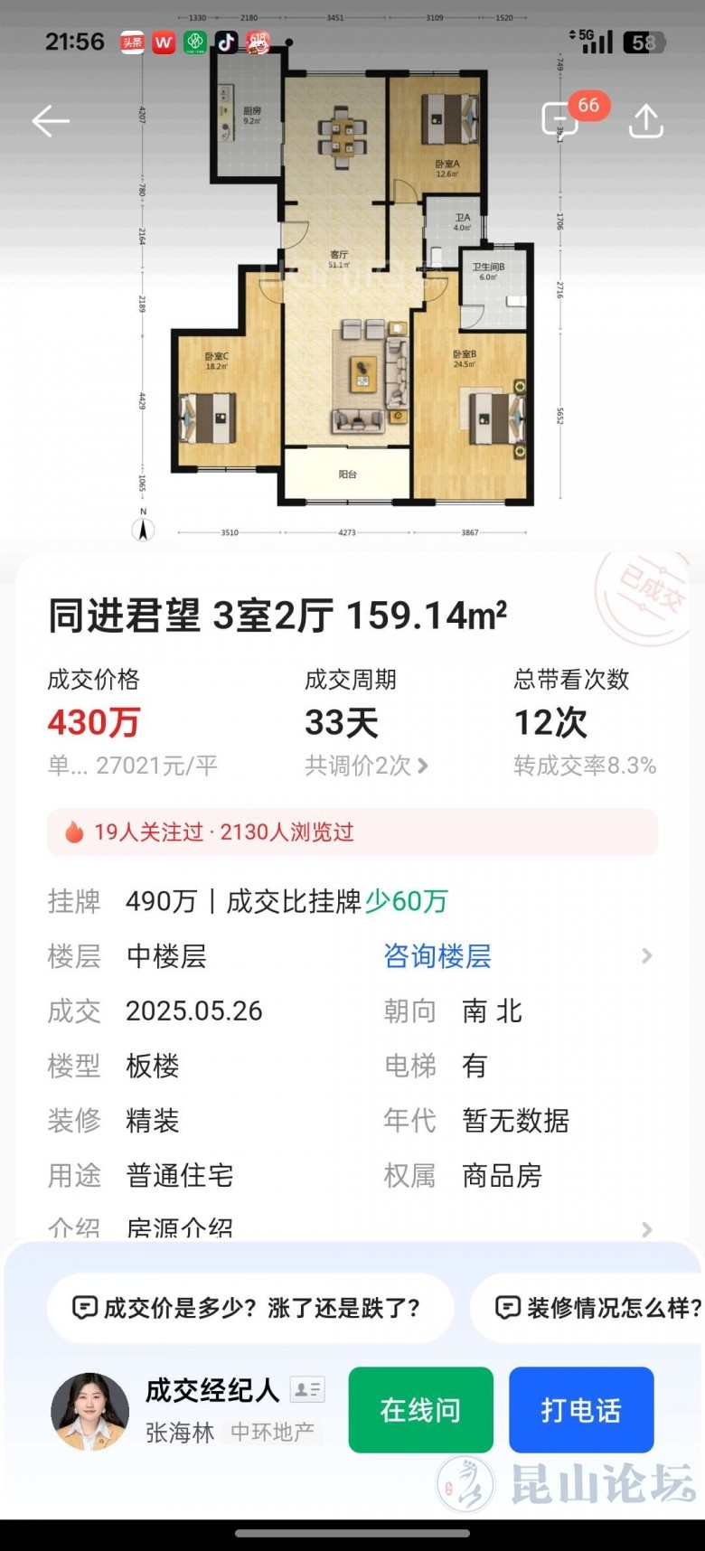 昆山除别墅以外的天花板“同进君望”,之前我刚发过2万6成交,但那个是毛坯的,又是低楼层,现在又成交了1套,几乎同样价格,但这次人家是中楼层又是精装的,下跌的趋势不减呐! ]t[%.^5#
