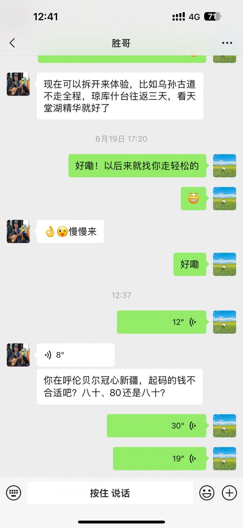 和万同学又说起新疆的景点骑马1小时80米,怕最近两年火了会不会涨价,刚才无聊的还问胜哥价格。