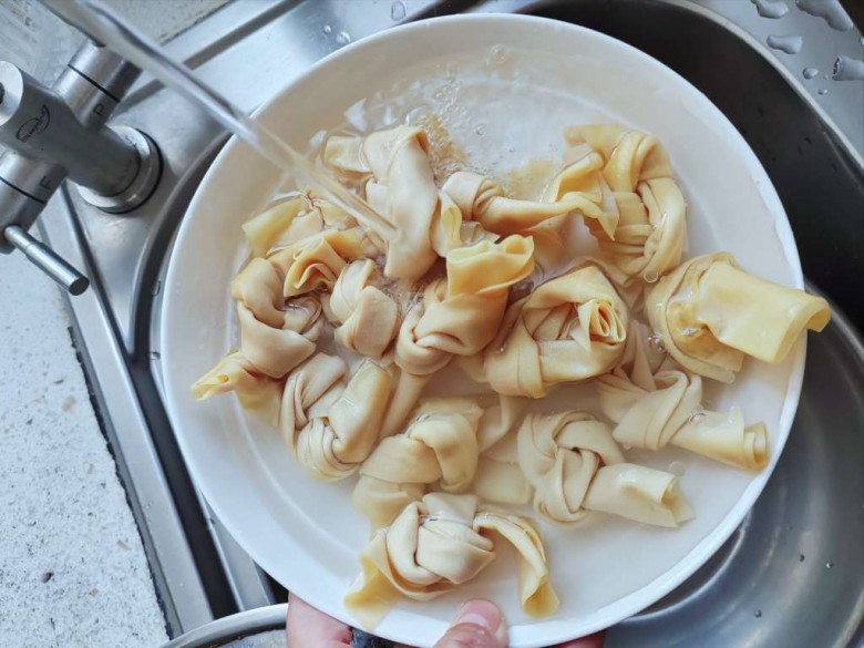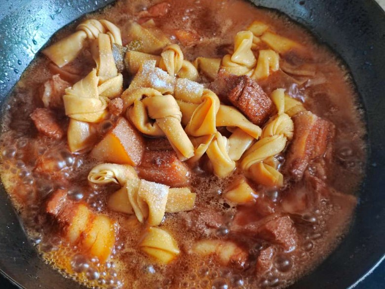 红烧肉要放百叶结,所以今天的汤汁留的多一点。红烧肉我都是用原色老冰糖,炖了一个多小时汤汁出油后放入百叶结,洗了两遍下锅,烧到差不多收汁~