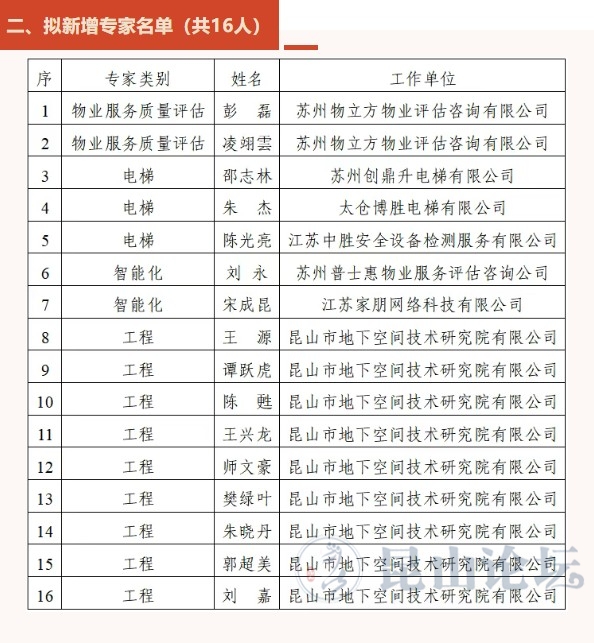 为进一步加强昆山市物业管理行业技能专家库建设,优化专家队伍结构,提升专家库的专业性、权威性和服务效能,更好地服务我市物业行业高质量发展,根据《昆山市物业服务管理协会专家库管理办法》相关规定,结合专家履职评估、专业领域覆盖需求及单位推荐情况,经资格审核、审议等程序,拟对专家库成员进行调整,现将名单公示如下: