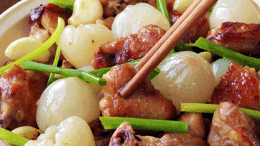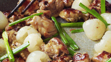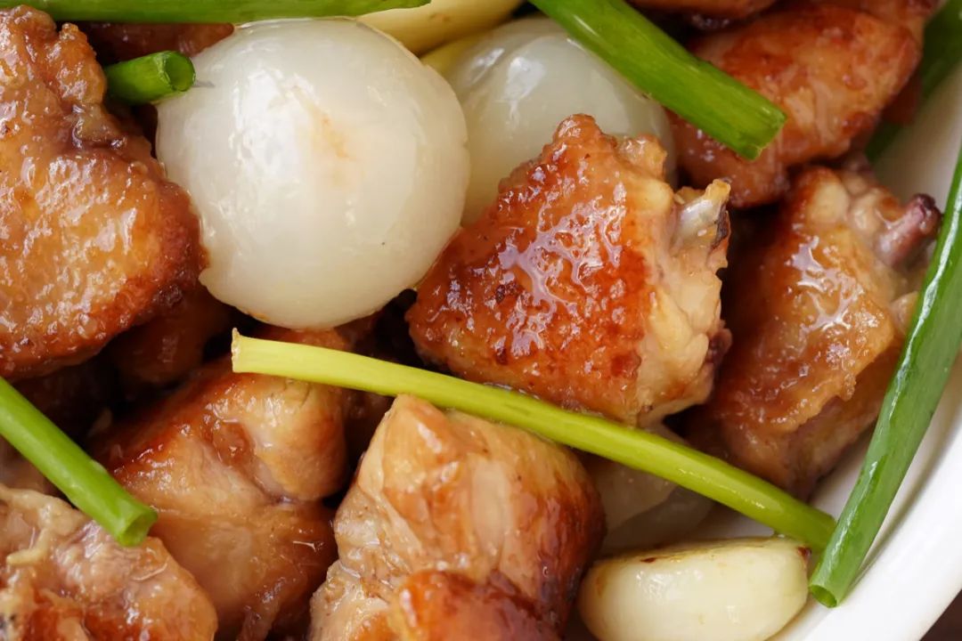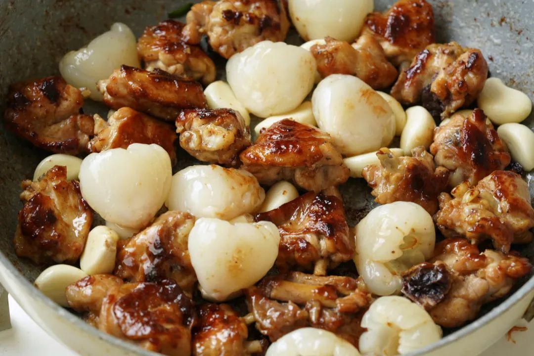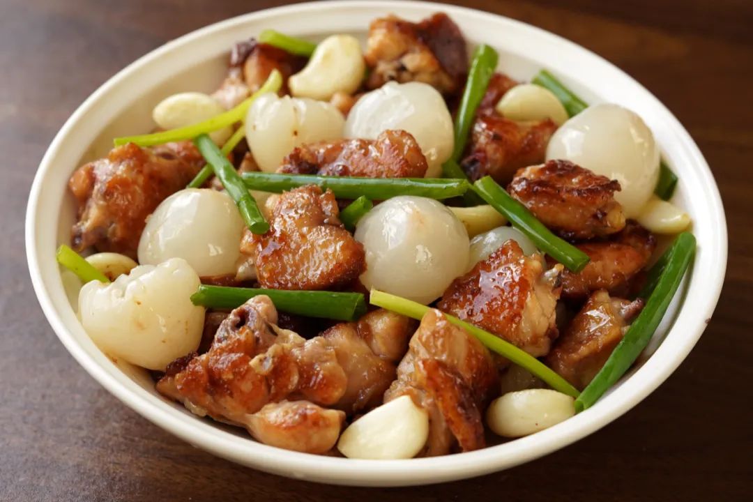 前几年试过荔枝烤鱼、荔枝虾滑烤肉。荔枝加肉很有灵性,今年做了一道新的,荔枝干煎鸡,清甜裹着香气。