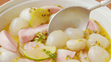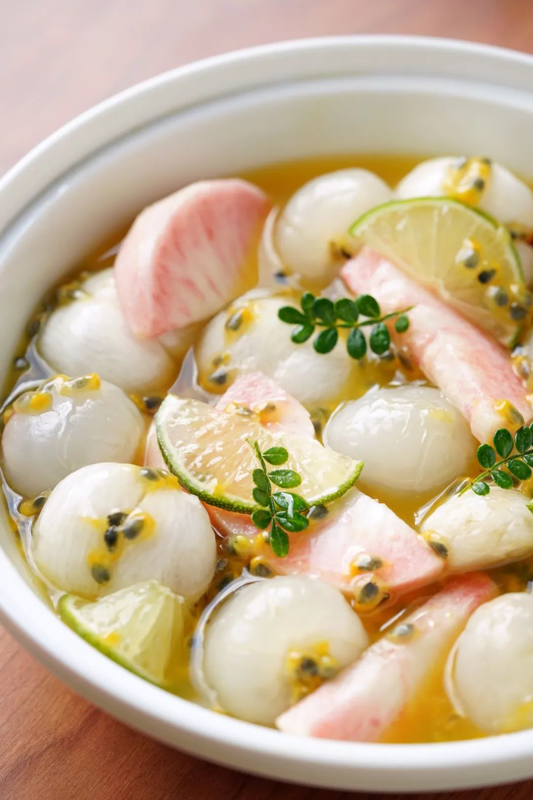 倒入百香果汁和一点蜂蜜,冰箱冷藏两个小时,甜酸刚好,柔软、爆汁、细腻,多种口感很层次。