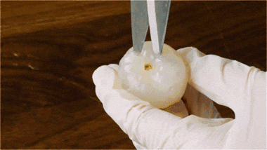 3、10颗荔枝去皮,用剪刀将果核边缘剪开后夹出果核去核。