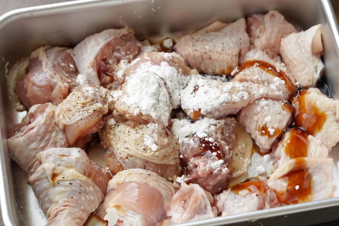 2、将鸡腿块和鸡翅块放入盘中,加入1勺生抽、1勺蚝油、1/3勺食用盐、1/4勺黑胡椒粉、1勺料酒、4片姜片、2勺淀粉,抓拌均匀,腌制20分钟。