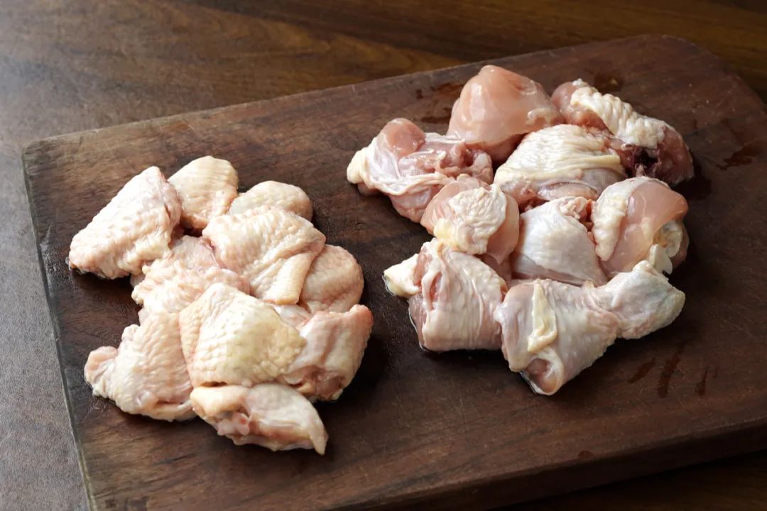 1、3个鸡琵琶腿切大块,6个鸡中翅对半切开。