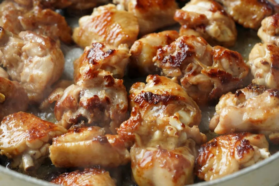 4、平底锅中放入1/2勺食用油,开中火,油热后放入鸡肉块,两面各煎3分钟左右至表面焦黄。加入30g大蒜粒,翻炒均匀。