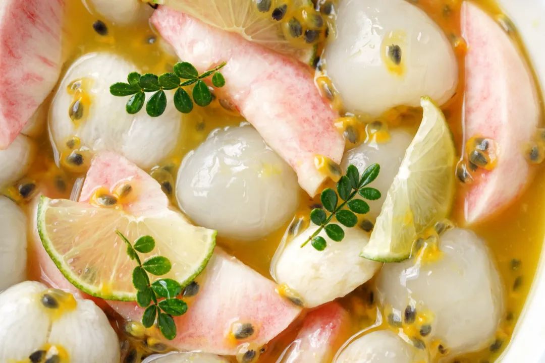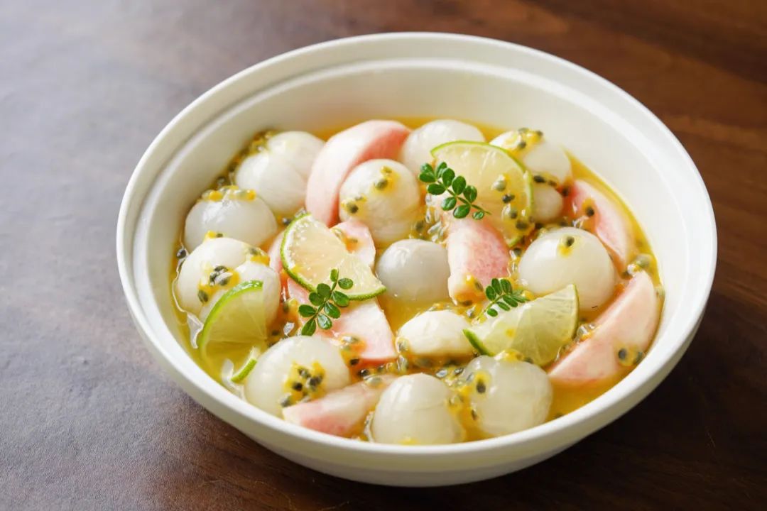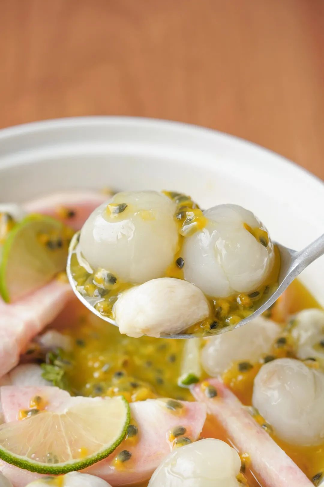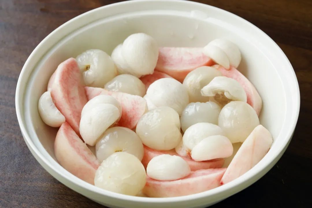 荔枝、蜜桃、山竹切好混在一起,夏天水果的最强形态,清新得像夏天雨后的果园。
