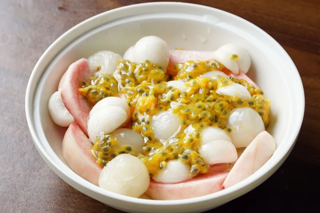 1、8颗荔枝去壳;1个脆桃去皮后切成月牙形,去核;2个山竹去壳,果肉掰成小块;4个百香果挖出果肉,将荔枝、桃子块、山竹果肉放在碗中。