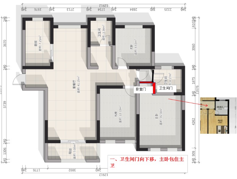 老老张:觉得原来的较合理,卫生间门在入户门后,在客厅适用性更好,改在和卧室对门不妥,要经常关门(上厕所,卧室都得关门)来客上上厕所也不便,(相对卧室的私密性) (2025-07-28 07:40)