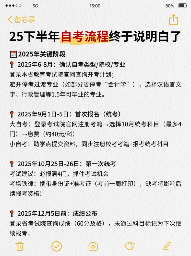 ✔️大自考:登录考试院官网注册考籍→选择10月统考科目(最多4门)→缴费(约40/科)