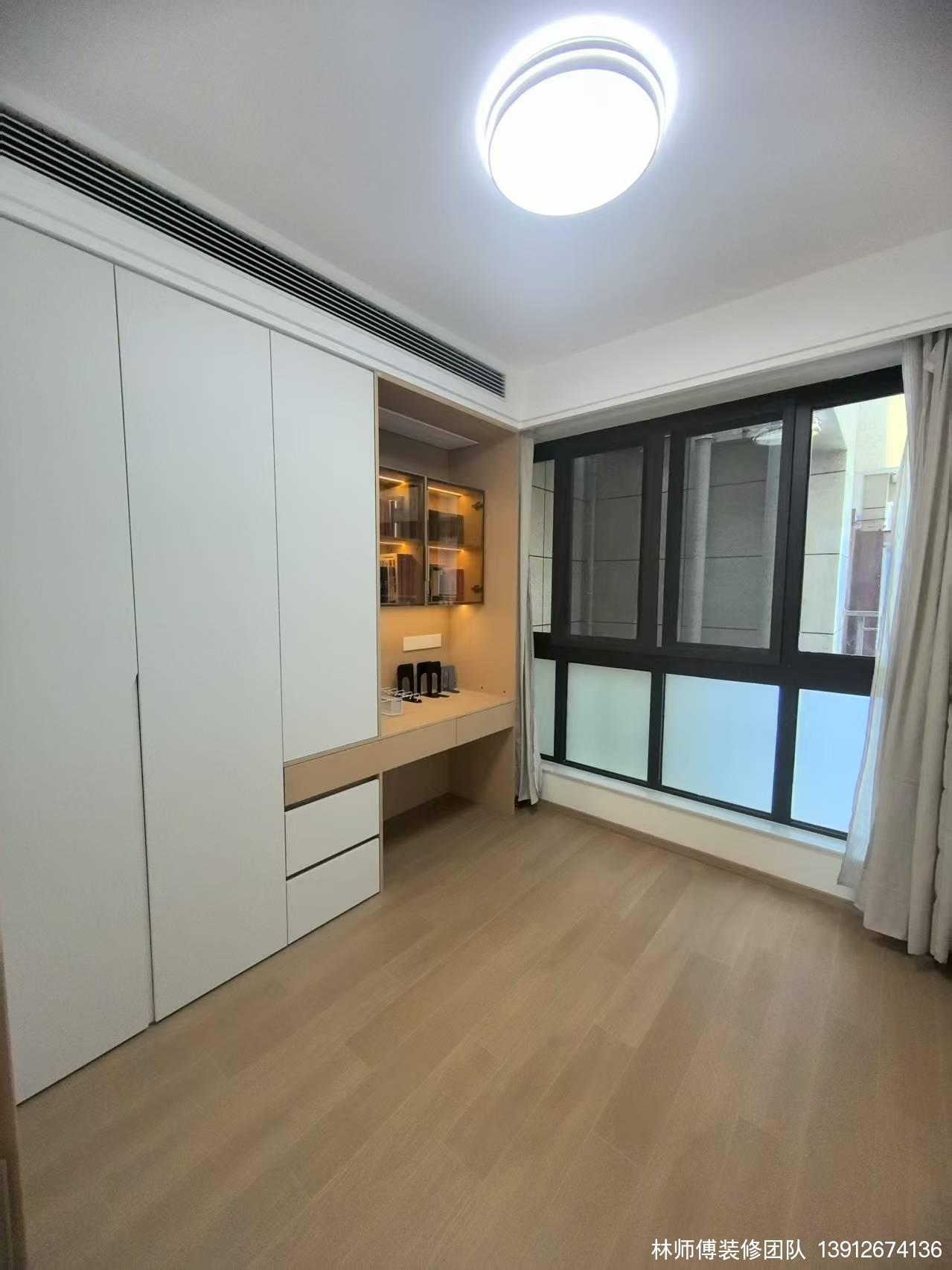 书房采用 "一柜到顶 + 悬浮书桌" 的组合,书桌上方留空做开放式书架,并预留插座,能满足笔记本电脑与其他电器同时使用。书桌右侧是一面大大的落地窗,白天沐浴阳光翻书,夜晚点亮台灯工作,一屋多用的设计完美适配小户型需求。