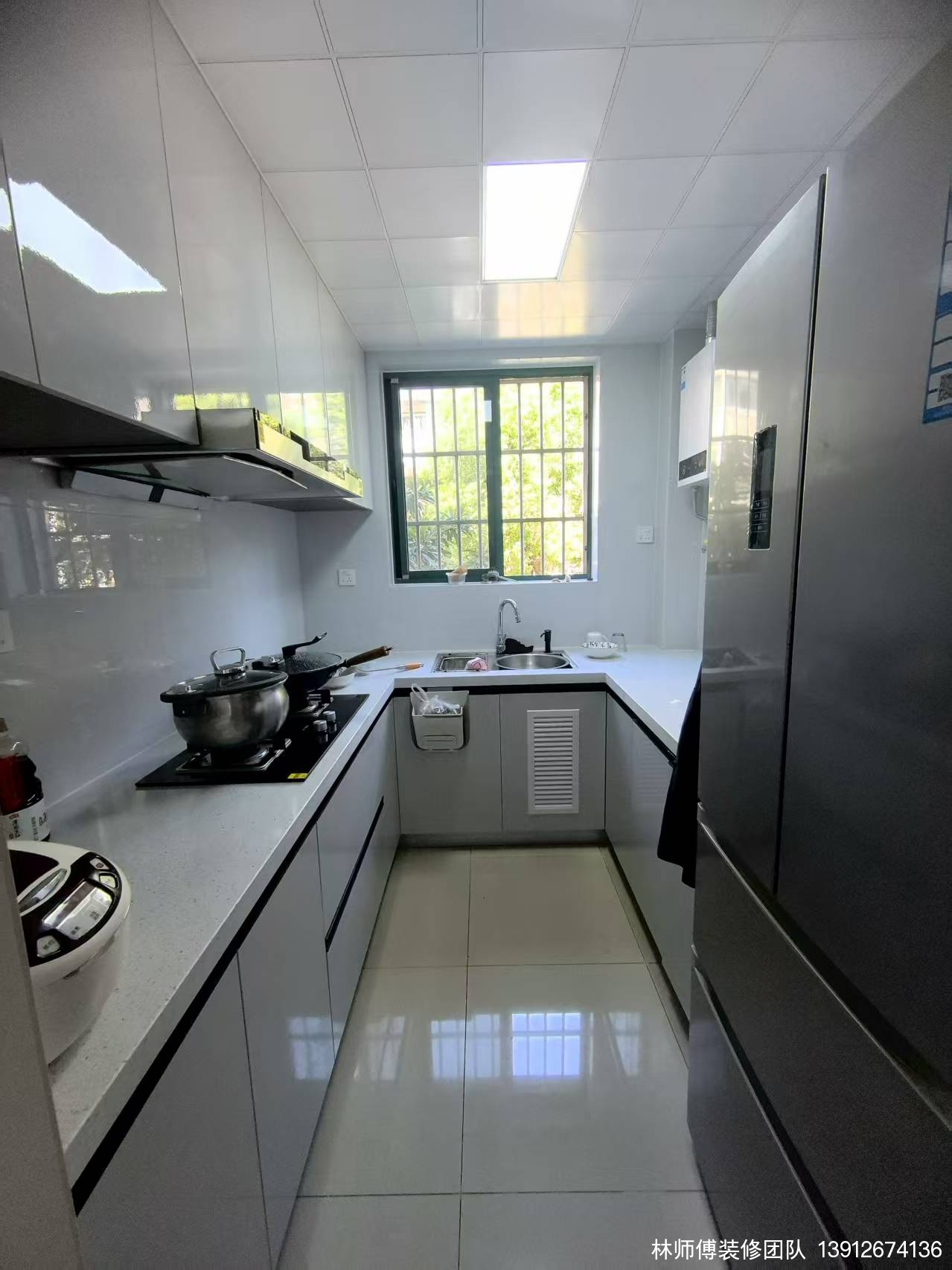 厨房进行了整体翻新,涵盖了墙面瓷砖、橱柜、吊顶、油烟机、热水器、台面、水槽等所有设施,真正实现了所见即所得。改造前,厨房非常简陋,除了基本的台面外,几乎没有其他设施。改造后,厨房采用 U 型布局,这种布局合理利用了空间,使得操作流程更加顺畅,洗、切、炒一气呵成。橱柜的设计根据厨房空间定制,收纳功能强大,满足了业主日常厨房用品的收纳需求。墙面瓷砖选择了易于清洁的款式,搭配简洁的吊顶,整个厨房看起来明亮、整洁。新安装的油烟机和热水器性能良好,提升了厨房的使用体验。