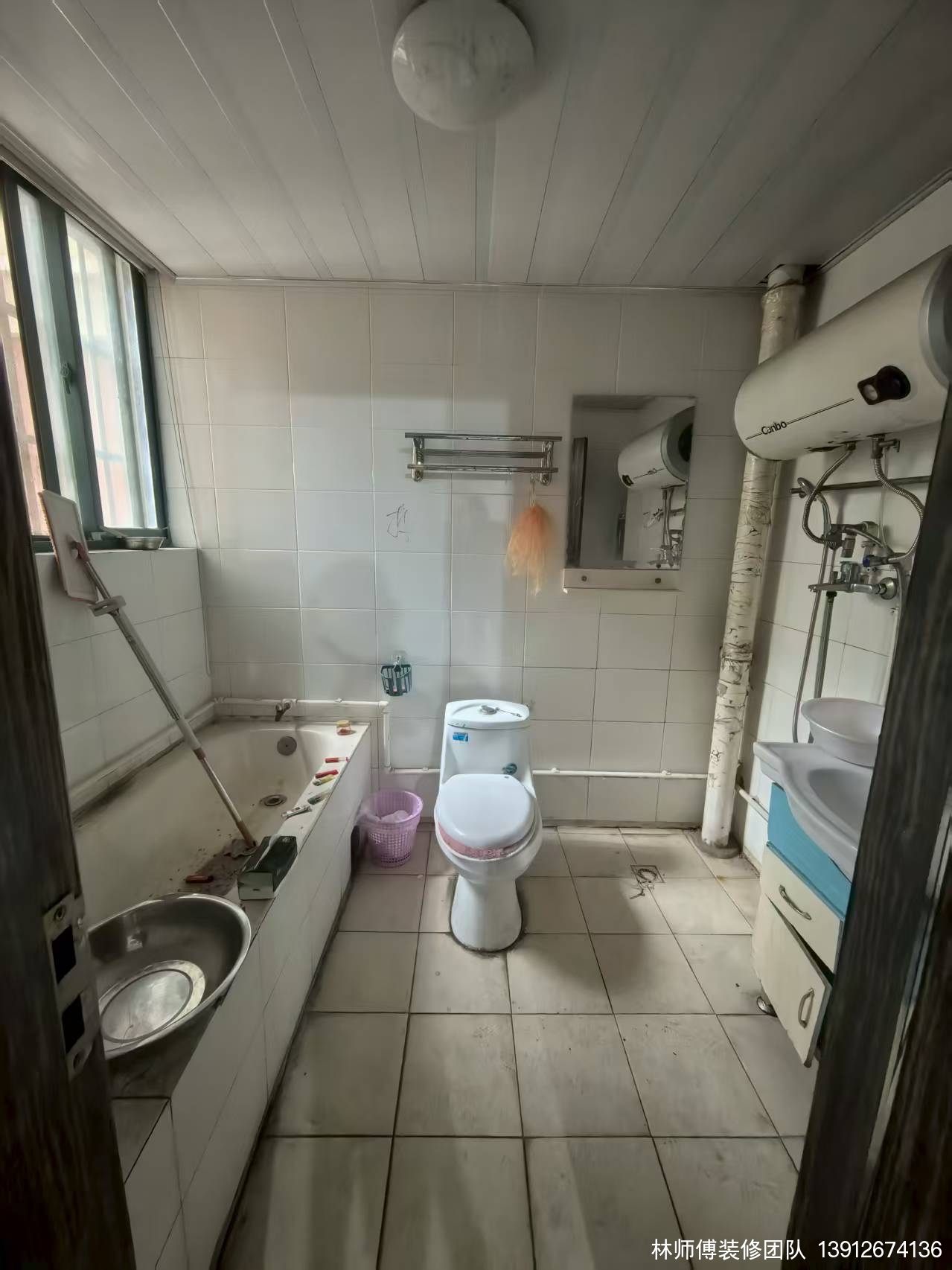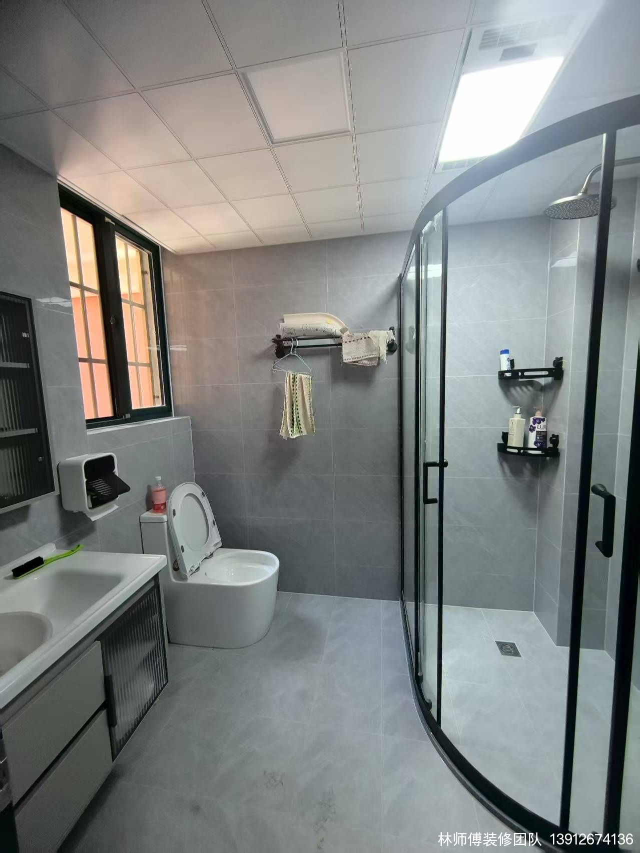 洗手间同样进行了整体翻新,选用了价格为 12888 元的套餐,包含门、马桶、花洒、洗手盆、吊灯等所有设施。改造前,洗手间老旧不堪,浴缸不仅不卫生且不容易清洁。改造后,墙面和地面换上了更耐脏的灰色瓷砖,整体色调更加沉稳大气。浴缸改为淋浴间,采用玻璃门隔断,有效防止水溅出,保持了洗手间的干燥整洁。新增加的水池柜带有多个抽屉和柜门,提供了充足的收纳空间,方便存放洗漱用品和清洁用品等。