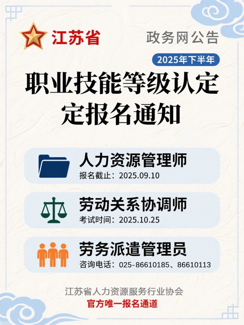 2、关注“江苏省人力资源服务行业协会”微信公众号,点击“在线报名”。同一考生同一批次只能报考一个职业,不能重复申报。已获取职业资格/技能等级证书的,不可申报同职业更低等级考试。
