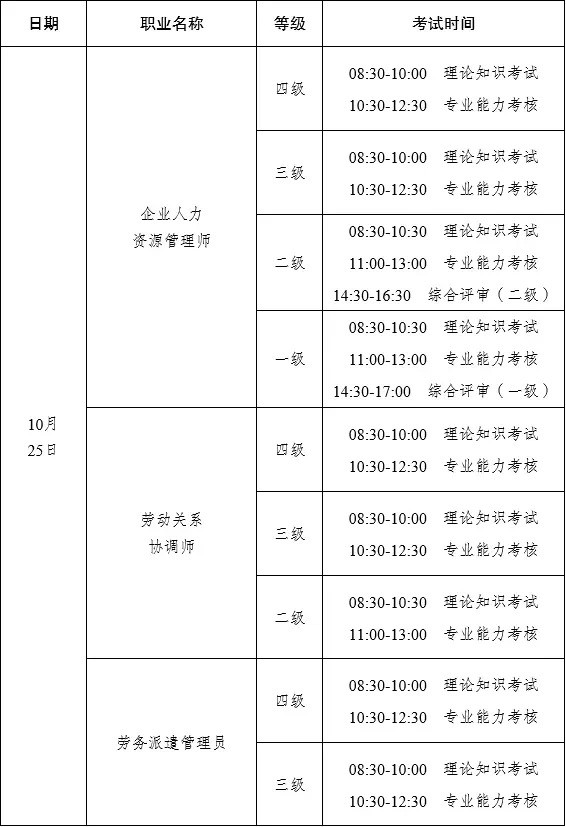 综合评审一级08:30-10:30 理论知识考试11:00-13:00 专业能力考核14:30-17:00 综合评审