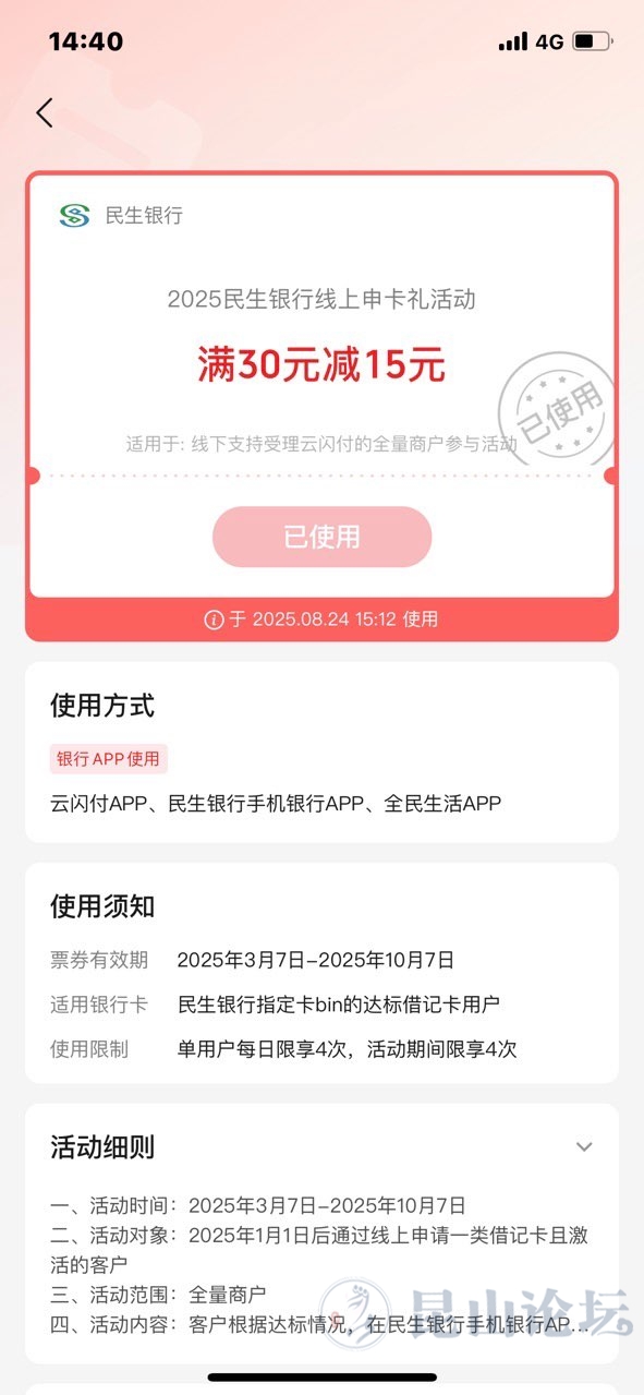 办了一张民生借记卡。送了两张满三十减十五的券。上面标明适用于线下支付。
