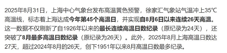 对面5条狗:就是23年,那年极端温度的天数多,但是断断续续的。今年温度没有23年高,持续时间长 (2025-09-01 13:20)