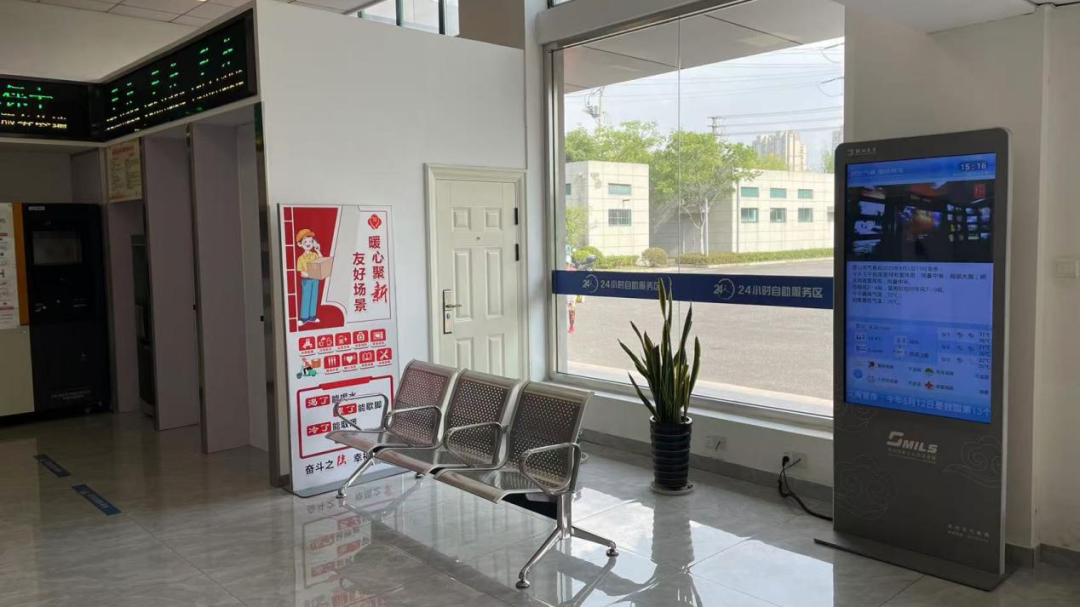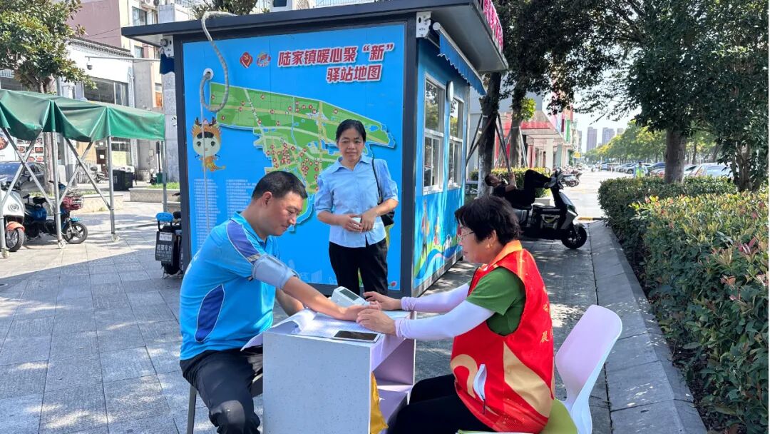 上午的送餐高峰刚过,外卖骑手小李在等单时,就近来到了陆家镇东方假日城小广场的暖“新”驿站。一位身穿红马甲的志愿者迎上前,笑着递来一杯凉白开,并提醒他:“师傅辛苦了,这边可以量个血压,歇一会儿再出发。”