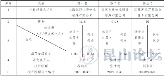 根据物业管理招标投标的有关法规、规章和该物业管理项目招标文件的规定,昆山高新区艺荟兰苑小区物业管理公开招标,于2025年09月02日开标,现评标工作已经结束,将开标结果公示如下:1、中标候选人情况 2、拟确定中标人:上海锐翔上房物业管理有限公司 公示期:自开标结果公示之日起三个工作日。对开标结果没有异议的,招标人将签发中标通知书。如有异议的可以向招标人提出书面异议,逾期不予受理。 招标人联系方式:13405100627。昆山高新区艺荟兰苑小区第一届业主委员会 2025年09月02日