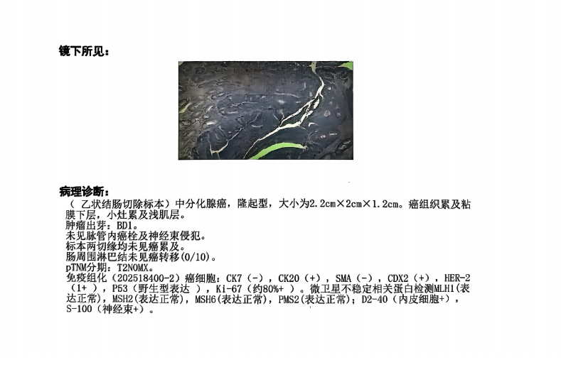 术后第 3 天,张先生就能下床慢慢走动;第 7 天,他已经能顺利吃粥、软面条,没有出现腹痛、腹胀等不适。更让他振奋的是,术后病理报告显示:PT2N0M0(结肠癌早期),切缘干净,无淋巴结转移!