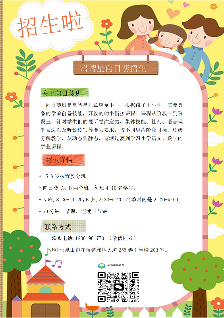 向日葵班招生简章关于向日葵班: 向日葵班是启智星儿童康复中心,根据孩子上小学,需要具备的学前前备技能,开设的幼小衔接课程。课程从阶段一到阶段三,针对学生们的视听觉注意力、集体技能、社交、语言理解表达以及听说读写等能力要求,按不同层次阶段目标,逐级分解教学,从动态到静态,逐渐过渡到学习小学语文、数学的学业课程。 招生详情:· 5-8岁按程度分班·向日葵 A、B两个班,每班4-10名学生。· A班:8:30-11:20,B班:2:30-5:20(冬季时间是2:00-4:50)·50分钟一节课,连续三节课