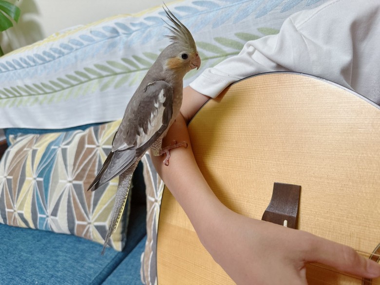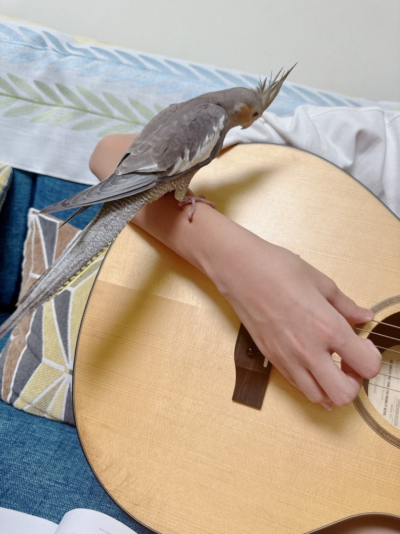这会好大儿弹吉他,它就站哥哥手臂上听着。