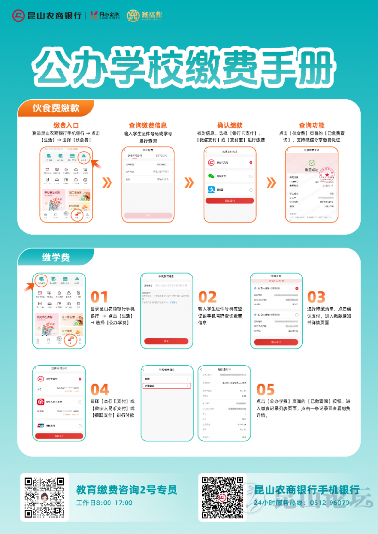无需办理昆山农商银行的银行卡,也可以下载、注册、登录昆山农商银行的手机银行,缴纳伙食费。缴费页面既支持昆山农商银行的银行卡,也支持其他银行的银行卡等多种支付方式。