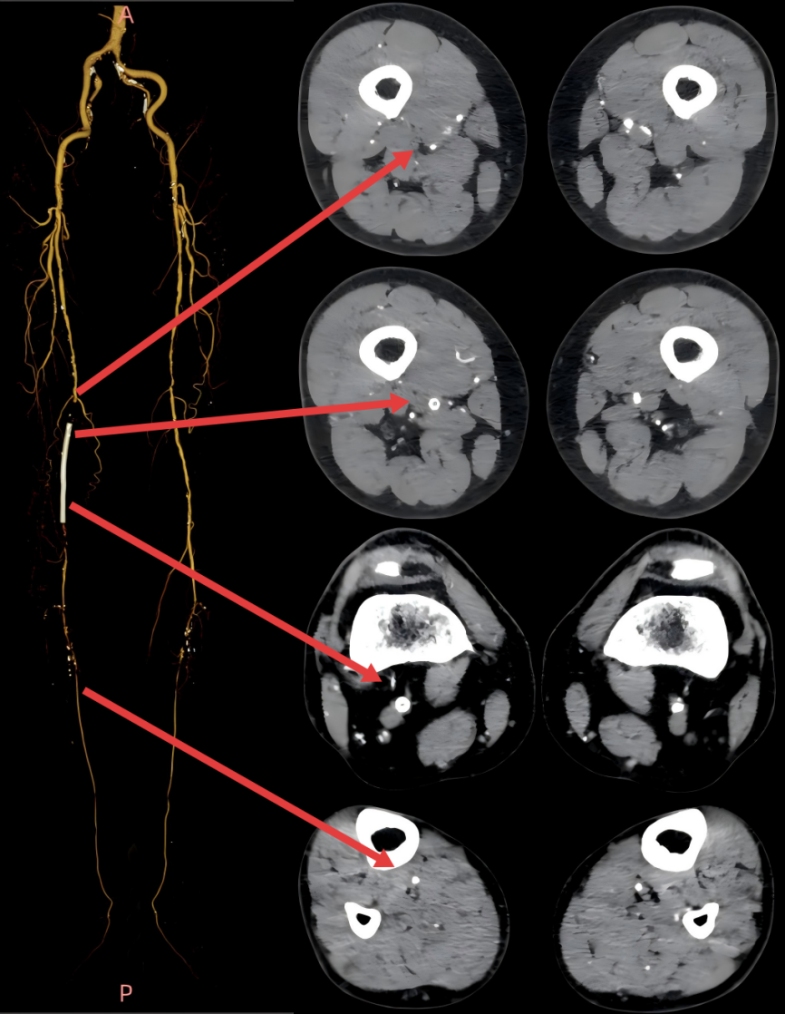 术前检查更是触目惊心:下肢动脉CTA显示,李大爷右股动脉支架已完全闭塞,腘动脉还有多处重度钙化狭窄,且仅膝下胫后动脉一条 “流出道”,治疗容不得半点差错。