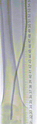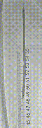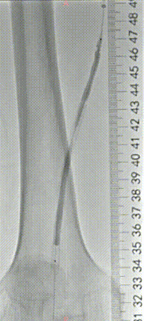 ▲采用导丝通过支架内闭塞段顺利,考虑为内膜增生合并部分陈旧性血栓病变,再次造影明确病变长度。