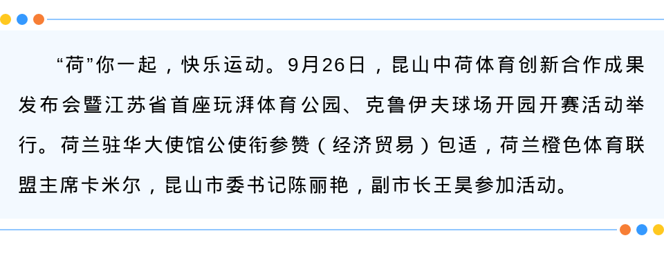“体育不仅是一种运动方式,更是一座沟通心灵的桥梁。”包适在致辞中表示,此次合作不仅标志着昆山市与荷兰伙伴携手的新起点,也将为两国人民的友谊与交流开启更加广阔的前景,希望不断拓展与昆山在体育、文化和经贸等领域的合作,共同为两国人民创造更加健康、快乐、充满活力的未来。