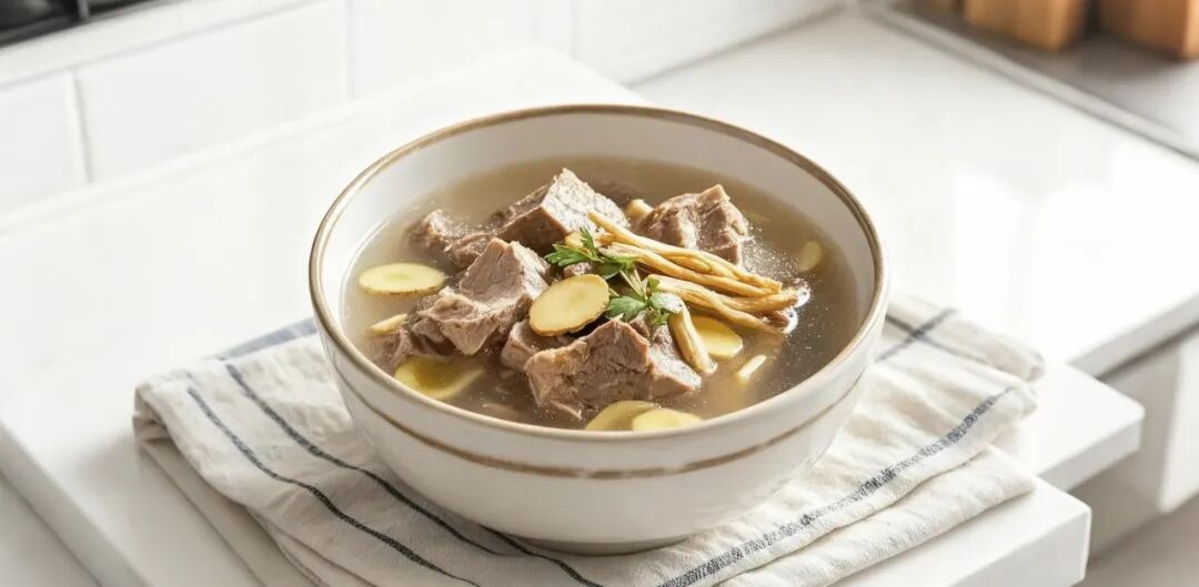 做法:羊肉焯水,与当归、生姜片一同放入砂锅,慢炖至肉烂,加盐调味即可。