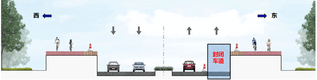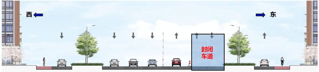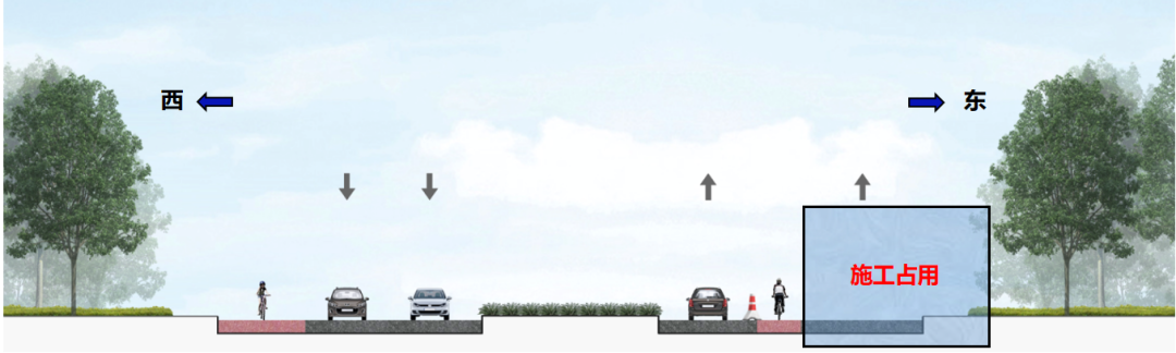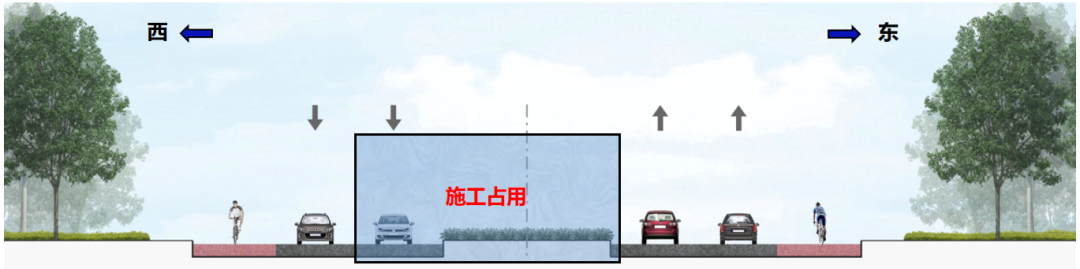 11月29日-1月29日,实施路侧开挖及中分带顶管施工,减少一条机动车道后双向保通,公交线路正常运行。