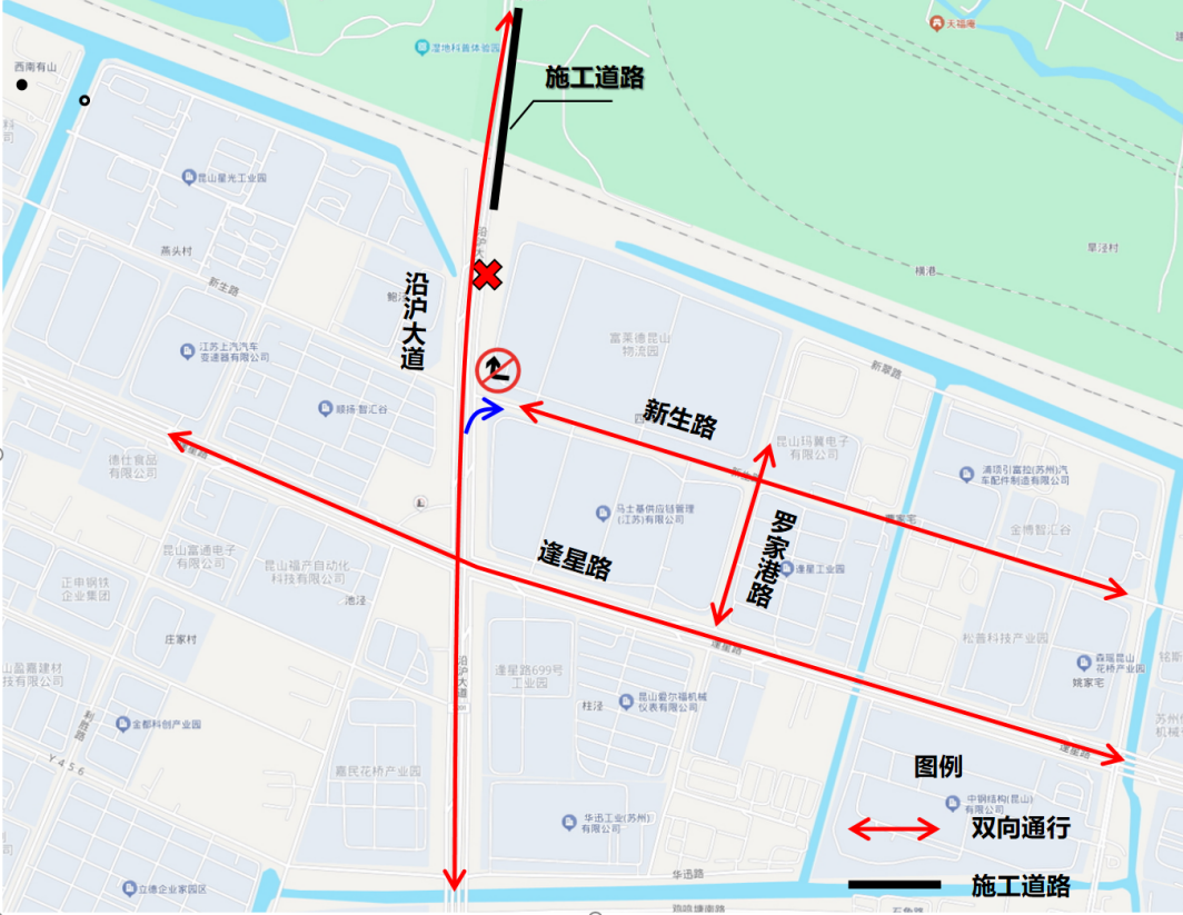 沿沪大道(新生路以北)辅道机动车道封闭,机动车可通过新生路、罗家港路右转进入逢星路、沿沪大道主路。